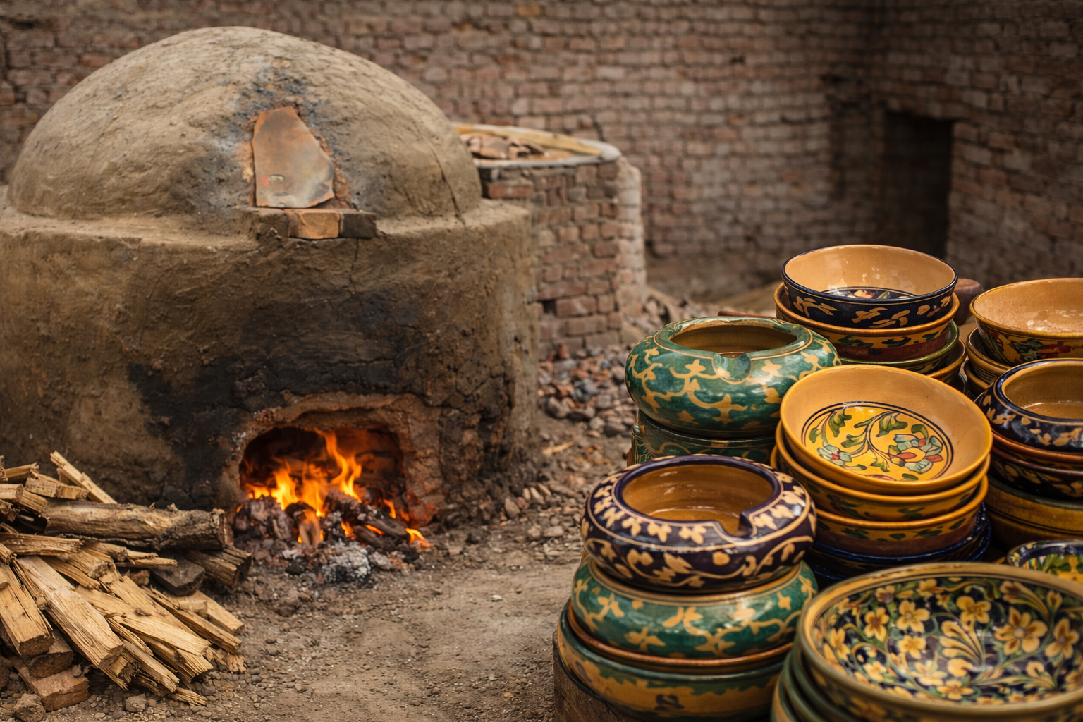 Our blue pottery making process follows traditional techniques practiced for generations. We begin by finely grinding quartz (kach), stone powder, and Multani Mitti to prepare the base material. Skilled artisans then hand-shape each piece, which is carefully dried, hand-painted, and glazed using classic blue and white designs. Finally, the products are fired in a traditional brick kiln, bringing out their distinctive color, strength, and lasting finish. Every step is carried out in our own factory to ensure authenticity and quality.